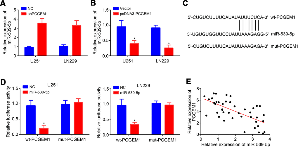 We further analyzed the potential miRNA target of PCGEM1 through miRDB tool. We identified miR-539-5p as the most potential candidate because it ranked top with the highest score. qRT-PCR analyses showed that PCGEM1 knockdown led to increased expression of miR-539-5p and vice versa (Figure 3A, 3B). Then, the wild-type (wt) and mutant (mut) luciferase reporter vectors were constructed (Figure 3C). Results showed that miR-539-5p mimics suppressed the activity of wt-PCGEM1 reporter in U251 and LN229 cells (Figure 3D), suggesting that PCGEM1 directly interacts with miR-539-5p. qRT-PCR results also indicated that miR-539-5p expression was reversely correlated with PCGEM1 in glioma tissues (Figure 3E).