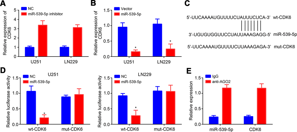 Afterwards, TargetScan tool was used to predict the target mRNA of miR-539-5p. CDK6 ranked top with the highest score. MiR-539-5p inhibition resulted in raised expression of CDK6 and vice versa (Figure 4A, 4B). Similarly, wt and mut-CDK6 luciferase reporter vectors were generated (Figure 4C). Luciferase reporter assay demonstrated the direct interaction between miR-539-5p and CDK6 (Figure 4D), which was further validated by RIP assay (Figure 4E).