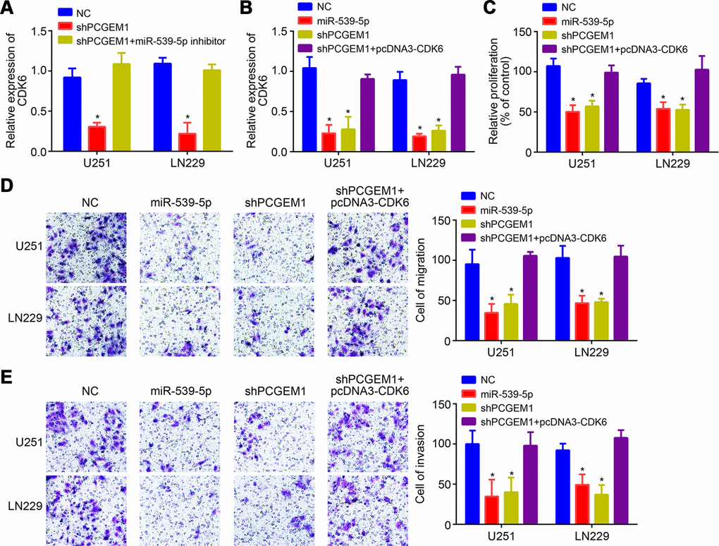 It was observed that PCGEM1 knockdown suppressed CDK6 expression while miR-539-5p inhibition rescued its expression (Figure 5A), indicating that PCGEM1 sponges miR-539-5p from CDK6 mRNA. Moreover, we noticed that miR-539-5p mimics or CDK6 silencing suppressed the proliferation, migration and invasion of glioma cells in vitro (Supplementary Figure 1A–1C). To explore whether PCGEM1 regulates glioma progression through miR-539-5p/CDK6 axis, CDK6 expression was rescued by transfection of pcDNA3-CDK6 vector (Figure 5B). Then CCK8 and transwell assays were conducted. Results showed that either PCGEM1 knockdown or miR-539-5p mimics suppressed glioma cell proliferation, migration and invasion while CDK6 overexpression reversed the effects of PCGEM1 knockdown (Figure 5C–5E). Therefore, PCGEM1 regulates miR-539-5p/CDK6 axis to promote glioma progression.