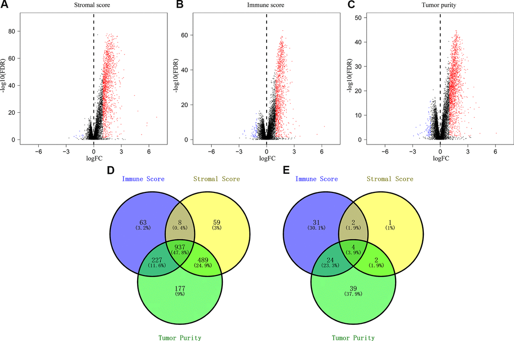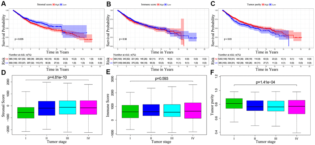 We downloaded OS and clinicopathological data for 1635 eligible CRC patients from the TCGA and GEO databases with a mean age of 68 years at diagnosis. Among these, 53.9% of the CRC patients were males. ESTIMATE results showed that immune scores ranged from -899.57 and 3202.84, stromal scores ranged from -2232.54 to 2193.08, and tumor purity ranged from 0.27 to 0.98. We then classified the CRC patients into low- and high-score groups based on their immune, stromal, and tumor purity scores, and investigated their correlation with OS rates. We observed positive correlation between stromal scores and OS of CRC patients (p=0.035; Figure 1A). However, immune scores did not show any significant correlation with OS of CRC patients (p=0.381; Figure 1B). We also observed negative correlation between tumor purity and OS (p=0.03; Figure 1C). We then assessed the relationship between immune scores, stromal scores and tumor purity with the pathological stages of CRC. We observed positive correlation between stromal scores and pathologic stage (p = 4.815e-10; Figure 1D). Immune scores were not associated with the pathological stage of CRC patients (p = 0.593; Figure 1E). Tumor purity showed inverse correlation with the pathological stages of CRC patients (p = 1.411e-04; Figure 1F).