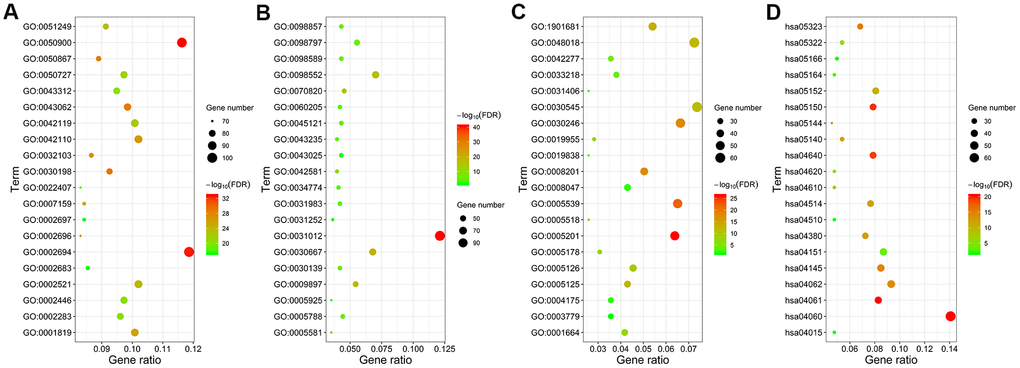 We performed functional enrichment analysis using the clusterProfiler R package and identified 1454 significantly enriched GO terms and 54 significantly enriched KEGG pathways (FDR<0.05) associated with the 941 differentially expressed IRGs. The top 20 GO terms and KEGG pathways are shown in Figure 3 and Supplementary Table 1. The top GO terms related to biological processes (BF) included regulation of leukocyte activation (GO:0002694), leukocyte migration (GO:0050900), and T cell activation (GO:0042110). The top GO terms related to cellular components (CC) were membrane (GO:0098552) and extracellular matrix (GO:0031012). The top GO terms related to molecular functions (MF) included receptor regulator activity (GO:0030545) and receptor ligand activity (GO:0048018). The top enriched KEGG pathways were cytokine-cytokine receptor interactions (hsa04060), chemokine signaling pathway (hsa04062), PI3K-Akt signaling pathway (hsa04151), and phagosomes (hsa04145).