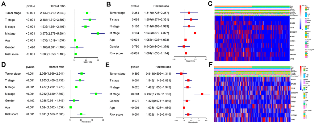 We performed univariate and multivariate Cox regression analyses using the TCGA and GEO CRC patient datasets after adjusting for clinicopathological parameters such as M stage, N stage, T stage, tumor stage, age and gender to determine if the risk score based on the ten-IRG signature accurately predicted prognosis of CRC patients. The results showed that the ten-IRG signature-based risk score was an independent prognosis factor for determining the OS of CRC patients from the two datasets (Figure 5A, 5B, 5D, 5E and Supplementary Figure 1). Next, we analyzed the correlation between the ten-IRG signature and other clinicopathological parameters using the Chi-square test. In the TCGA cohort, the higher risk score based on the ten-IRG signature was associated with tumor stage (p<0.001), M stage (p<0.05), N stage (p<0.001), and T stage (p<0.001) (Figure 5C), but was not related to gender and age of CRC patients. We obtained similar results with the GSE39582 validation cohort of CRC patients (Figure 5F).