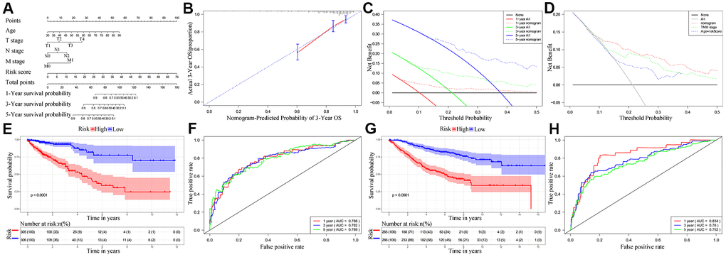 Next, we analyzed if the ten-IRG prognostic signature would enhance the accuracy of predicting OS of CRC patients. Towards this, we constructed a nomogram with the ten-IRG signature-based risk score, M stage, N stage, T stage, and age to determine the 1-, 3-, and 5-year OS of CRC patients (Figure 6A). The calibration plots showed that the nomogram accurately predicted the 3-year OS of CRC patients (Figure 6B). Overall, the nomogram significantly improved the prediction of the 1-, 3-, and 5-year OS of CRC patients (Figure 6C). The OS prediction of the nomogram was significantly higher compared to the OS prediction based on TNM stages alone or age plus the ten-IRG signature-based risk score (Figure 6D). The C-index value for the nomogram was 0.769 (95% CI, 0.717-0.821). The AUC values for the 1-, 3-, and 5-year OS based on the nomogram were 0.788, 0.782 and 0.789, respectively (Figure 6F). We then verified the predictive value of the nomogram in the TCGA and GSE39582 validation cohorts. The C-index value for the internal validation cohort (TCGA) was 0.781 (95% CI, 0.709-0.853), and the AUC values for 1-, 3-, and 5-year OS were 0.834, 0.780, and 0.752, respectively (Supplementary Figure 2). The C-index value for the GSE39582 cohort was 0.732 (95% CI, 0.691-0.773) and the AUC values for 1-, 3-, and 5-year OS were 0.834, 0.780, and 0.752, respectively (Figure 6H). Furthermore, we stratified the CRC patients into high- and low-risk groups based on the median risk score cut off value of the nomogram. Kaplan-Meier survival curves and time-dependent ROC curves showed significantly worse survival outcomes for patients from the high-risk group compared to those from the low-risk group in both the TCGA cohort (P<0.001; Figure 6E, 6F) and GSE39582 cohort (P<0.001; Figure 6G, 6H and Supplementary Figure 2).
