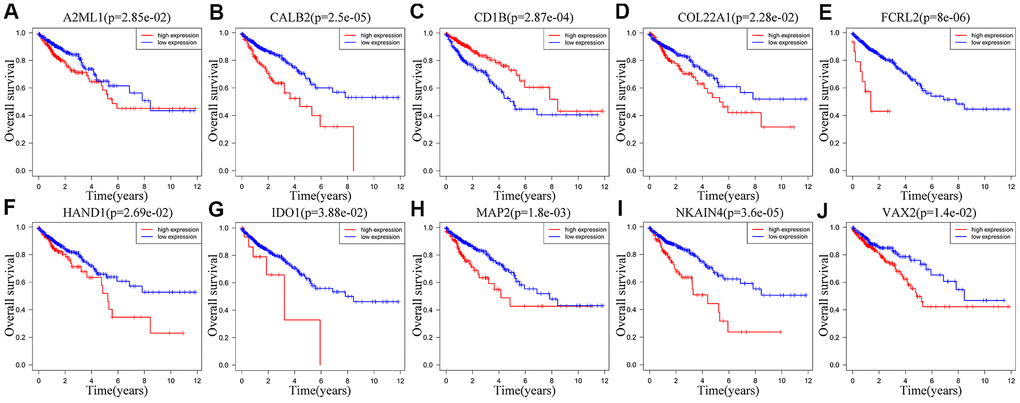 We performed Kaplan-Meier survival curve analysis of the TCGA-CRC patients based on the expression of the ten prognostic IRGs to determine their independent prognostic values. High expression of A2ML1 (Figure 7A), CALB2 (Figure 7B), COL22A1 (Figure 7D), FCRL2 (Figure 7E), HAND1 (Figure 7F), IDO1 (cut off value: 34, Figure 7G), MAP2 (Figure 7H), NKAIN4 (Figure 7I) and VAX2 (Figure 7J) correlated with shorter OS in CRC patients, whereas, high expression of CD1B (Figure 7C) significantly correlated with longer OS. We observed similar results in the GSE39582 cohort (Supplementary Figure 3A–3J). Interestingly, IDO1 may also have another tumor suppressor gene identity in the GSE39582 cohort (Supplementary Figure 3G) and in TCGA database when expression was between 1.06 and 34 (Supplementary Figure 4).