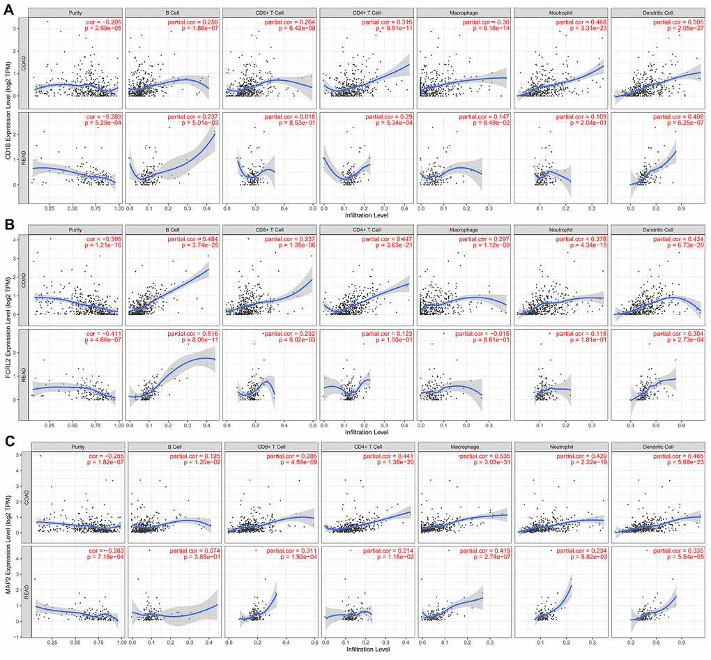 We performed TIMER database analysis to determine the correlation between the ten-IRG prognostic signature and tumor infiltration of six types of immune cells, namely B cells, CD4+ T cells, CD8+ T cells, macrophages, neutrophils, and dendritic cells in the TME. The ten-IRG signature-related risk score showed positive correlation with the levels of CD4+ T cells, CD8+ T cells, macrophages, neutrophils, and dendritic cells in the TME (all P < 0.05), but was not significantly associated with the levels of B cells (P > 0.05; Figure 8). The levels of CD1B expression correlated with the infiltration levels of neutrophils (r= 0.468, p= 3.31E-23) and dendritic cells (r = 0.505, P = 2.05E-27) in colon adenocarcinoma (COAD) samples (Figure 9A and Table 1). Moreover, FCRL2 expression levels showed significant correlation with the infiltration levels of B cells (r= 0.484, p= 3.74E-25), CD4+ T Cells (r= 0.447, p= 3.63E-21), and dendritic cells (r = 0.434, P = 6.73E-20) (Figure 9B and Table 1). IDO1 expression levels were significantly associated with the infiltration levels of CD8+ T cells (r = 0.4, P = 4.66E-17), neutrophils (r= 0.638, p= 3.97E-47), and dendritic cells (r = 0.564, P = 3.47E-35) (Table 1). MAP2 expression levels were significantly associated with the infiltration levels of CD4+ T Cells (r= 0.441, p= 1.38E-20), macrophages (r= 0.535, p= 3.03E-31), and dendritic cells (r = 0.465, P = 5.68E-23) (Figure 9C and Table 1).