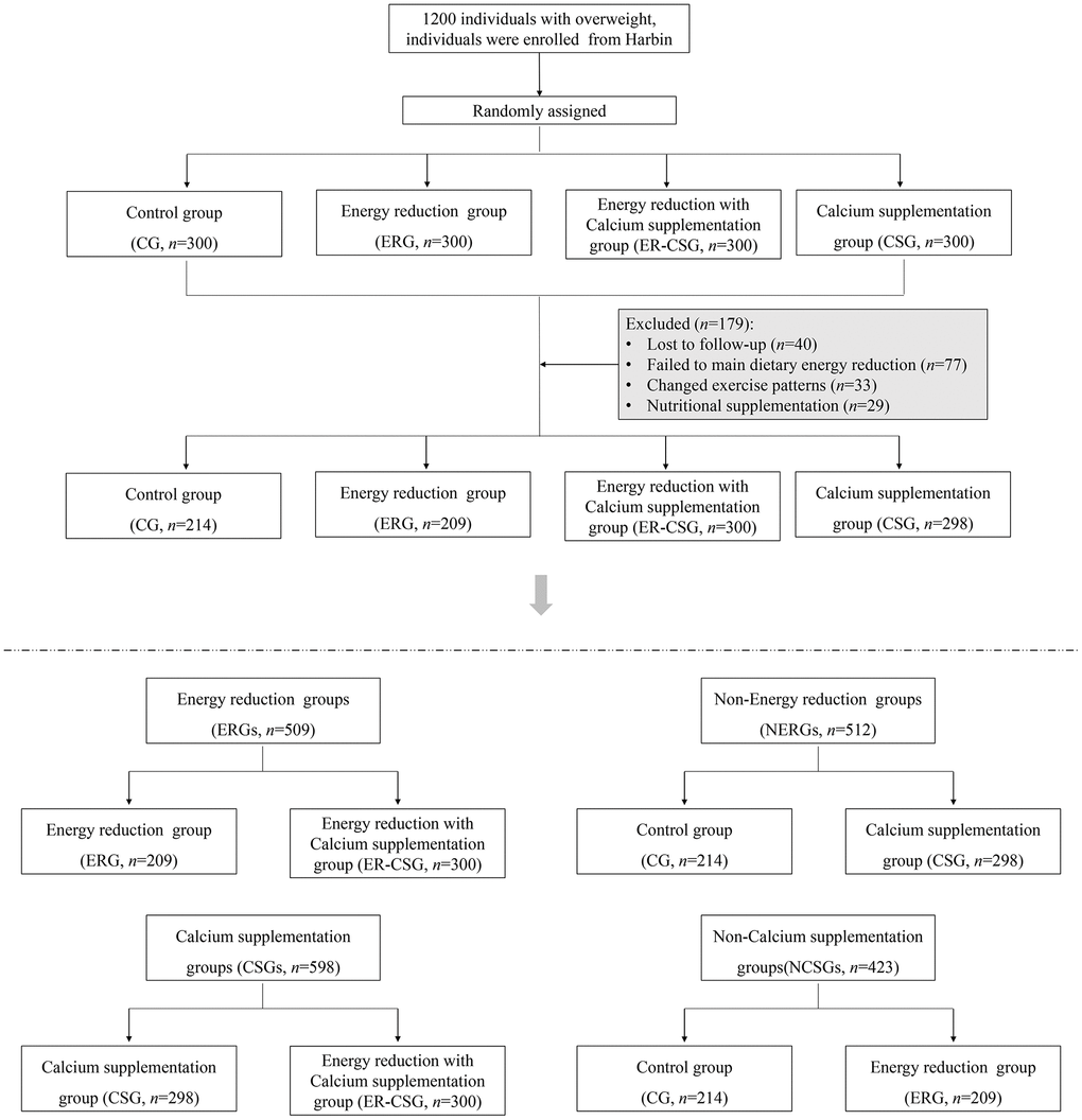 After the intervention, 179 participants have been excluded due to loss of follow-up, poor compliance, and medications. A total of 1021 overweight participants with low dietary calcium intake were finally recruited, details are shown in the flow diagram Figure 1. Specifically, 1) 209 participants were in the energy-reduction group (ERG), which reduced the dietary energy intake while maintaining the original calcium intake, 2) 298 participants were in the calcium supplementation group (CSG), which maintained the original dietary energy intake while receiving calcium supplementation, 3) 300 participants were in the energy-reduction with calcium supplementation group (ER-CSG), which reduced the dietary energy intake and received calcium supplementation. And the 214 participants without dietary intervention were set as the control group (CG). Among them, 509 participants with reducing energy intake were assigned to the energy-reduction groups (ERGs), 512 participants without reducing energy intake were assigned to the non-energy-reduction groups (NERGs). In addition, 598 participants with calcium supplementation were assigned to the calcium supplementation groups (CSGs), and 423 participants without calcium supplementation were assigned to the non-calcium supplementation groups (NCSGs).