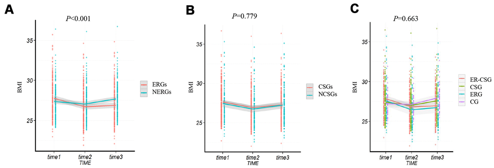 After the dietary energy restriction, the dietary alteration in the ERGs and NERGs are presented in Supplementary Table 1. In comparison to the dietary information at baseline, participants in the ERGs had lower intakes of rice, wheat, potato, beans, livestock, poultry, eggs, snack, and micronutrients (carbohydrate, protein, lipid), while had higher intakes of vegetables and fruits. The ERGs had an average decreased energy intake of 492 kcal/d (23%) after the 2-year intervention. However, compared to baseline, the NERGs had higher intakes of wheat, potato, beans, livestock, poultry, fish, snack, carbohydrate, and had an average increased energy intake of 106 kcal/d (5%) after the intervention. After the 2 years dietary intervention, the ΔBMI (body mass index) in the ERGs showed a significant decrease (-0.9 kg/m2, P <0.001, Figure 2A), compared to the NERGs (0.3 kg/m2). Whereas, no significant difference of ΔBMI was observed between the CSGs and NCSGs (-0.3 kg/m2 vs -0.2 kg/m2, P=0.779, Figure 2B). In addition, the ΔBMI in the CG, ERG, CSG, and ER-CSG was 0.7 kg/m2, -0.9kg/m2, 0.2 kg/m2 and -1kg/m2, respectively. The four intervention models had no significant difference in ΔBMI (P=0.663, Figure 2C).