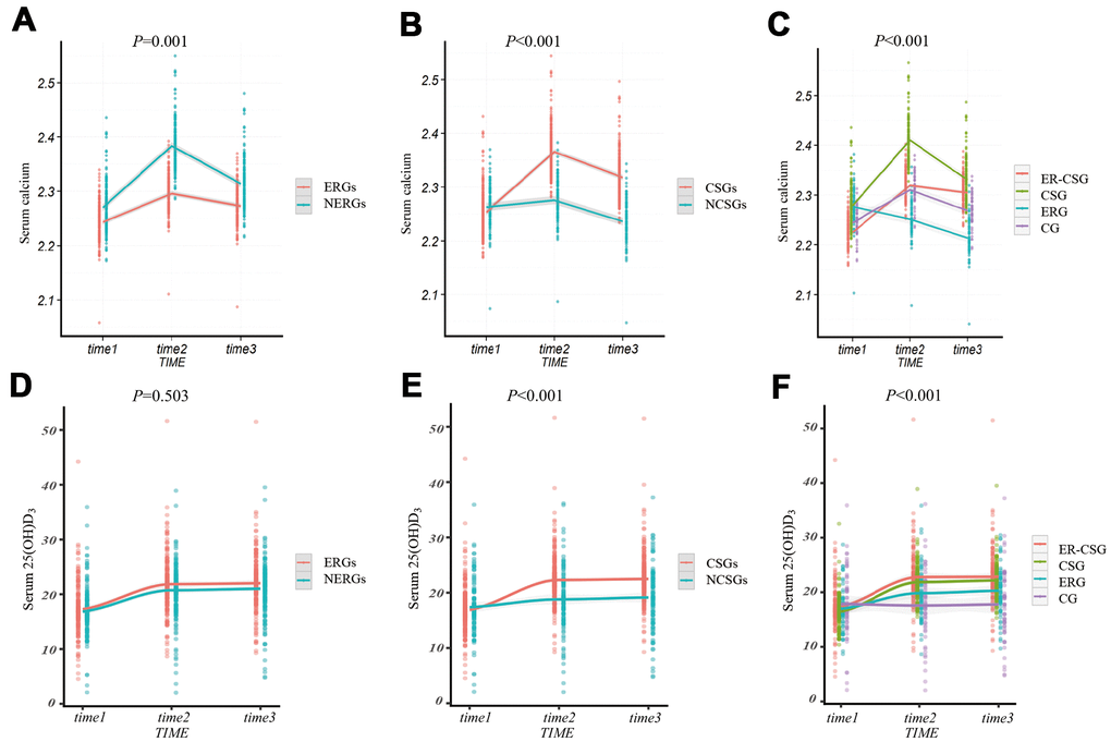 After adjustments for confounding factors, participants in the ERGs had a lower Δserum calcium than participants in NERGs (0.03 mmol/L vs 0.04 mmol/L, P=0.001, Figure 3A). The Δserum calcium in the CSGs displayed a significant increase, compared to that in the NCSGs (0.07 mmol/L vs -0.02 mmol/L, P<0.001, Figure 3B). We also found that the ER-CSG had the highest Δserum calcium value (0.08 mmol/L, all the P<0.001, Figure 3C) in the four groups. In addition, the Δserum 25(OH)D3 level was not significantly different between the NERGs and ERGs (4.17 ng/ml vs 4.76 ng/ml, P=0.503, Figure 3D); and compared to the NCSGs, the Δserum 25(OH)D3 in the CSGs was significantly increased (1.76 ng/ml vs 5.58 ng/ml, P<0.001, Figure 3E). Besides, the ER-CSG had a higher Δserum 25(OH)D3 (6.23 ng/ml, Figure 3F), compared to the other three groups (all the P<0.001).