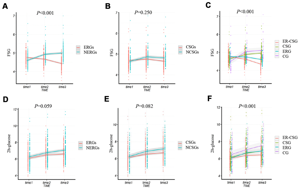 Compared to the other three groups, the ER-CSG had a higher reduction in the ΔFSG (-0.42 mmol/L, all the P <0.001, Figure 4C). Although the 2h-glucose presented an upward trend, participants in the ER-CSG had the lowest increase in Δ2h-glucose among all the groups (0.37 mmol/L, all the P <0.001, Figure 4F).