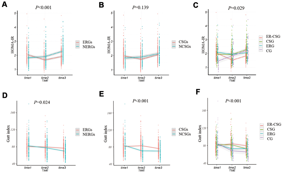 Participants in the ERGs had a higher ΔGutt index than participants in the NERGs(-5.82 vs -10.48, P=0.024, Figure 5D). Similarly, the participants in the CSGs also presented a significantly higher ΔGutt index, compared to the participants in the NCSGs (-5.46 vs -13.75, P<0.001, Figure 5E). Besides, the ER-CSG had a higher ΔGutt index, when comparing to the other groups (-0.73, P<0.001, Figure 5F).