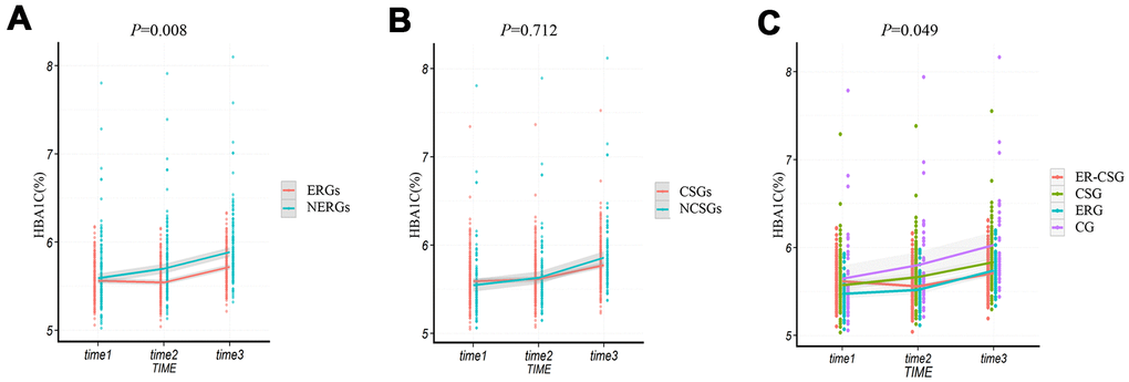 Similar to the results of Δ2h-glucose, the averages of ΔHbA1c (glycated hemoglobin) in all groups had increasing trends. And the ERGs had a lower upward value of ΔHbA1c than the NERGs (0.16% vs 0.30%, P=0.008, Figure 6A). However, no significant difference in ΔHbA1c level was found between the CSGs and NCSGs (0.18% vs 0.32%, P=0.712, Figure 6B). And non-significant difference in ΔHbA1c was also observed among the four groups (ER-CSG: 0.10%, CSG: 0.26%, ERG: 0.27%, CG: 0.38%, P=0.049, Figure 6C).