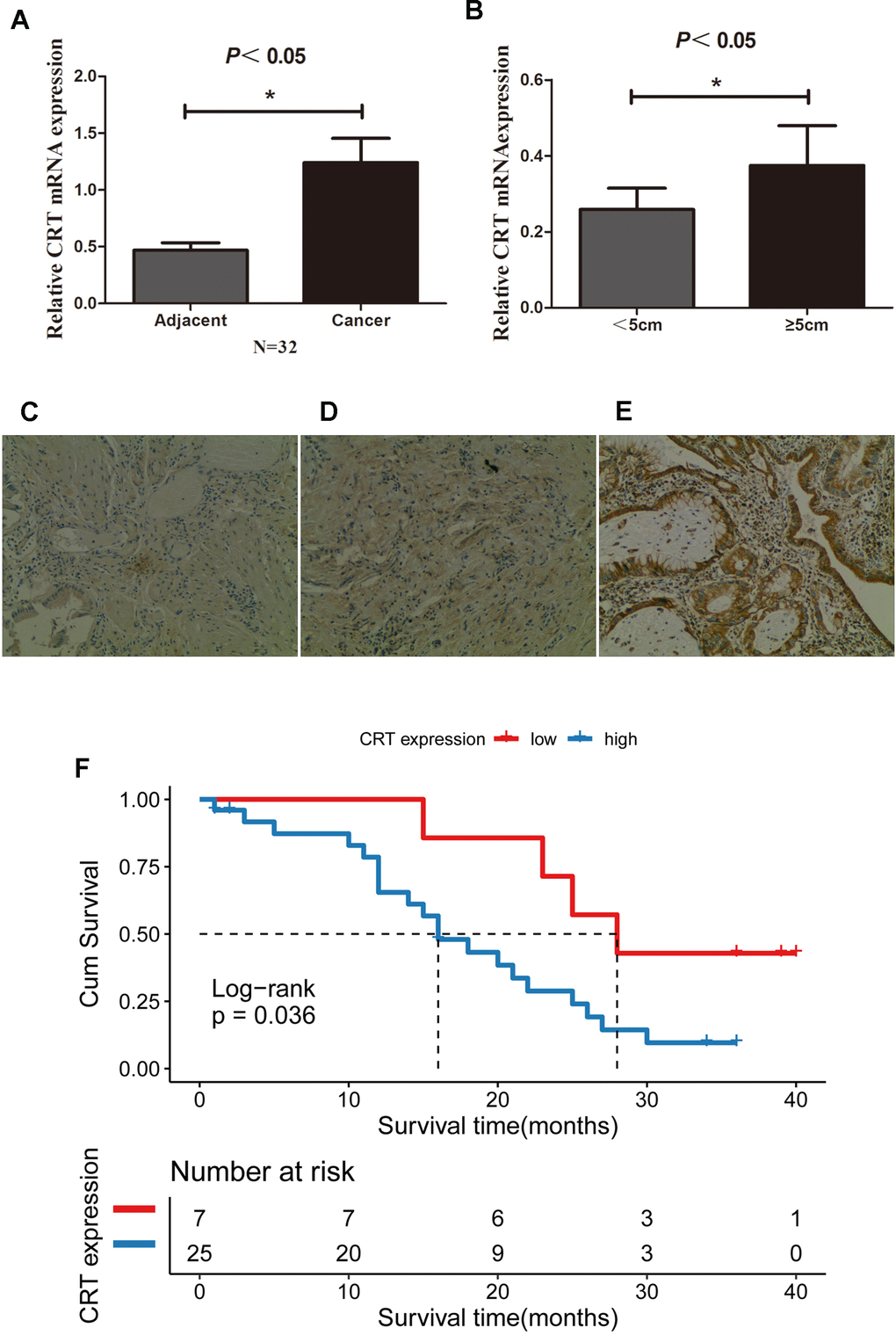 The CRT mRNA and protein level in 32 paired GBC and adjacent normal gallbladder tissues were examined using RT-qPCR and IHC. The present results suggested that the expression of CRT was significantly higher in 25/32 GBC tissues compared with adjacent normal gallbladder tissues and chronic cholecystitis tissues (Figure 1A, B). In addition, the mRNA expression of CRT was higher in patients with a tumor size≥5 cm compared with patients with a tumor size <5cm. In addition, the expression of CRT in gallbladder tissues was also detected by IHC (Figure 1C–1E). The expression of CRT was increased in GBC tissues, which was consistent with the results obtained from the RT-qPCR analysis. Besides, patients with high CRT expression (median survival time = 16months, had an obviously poorer overall survival rate than those with low CRT expression (median survival time =28 months, P<0.05 log-rank test:χ2 =4.414) (Figure 1F).