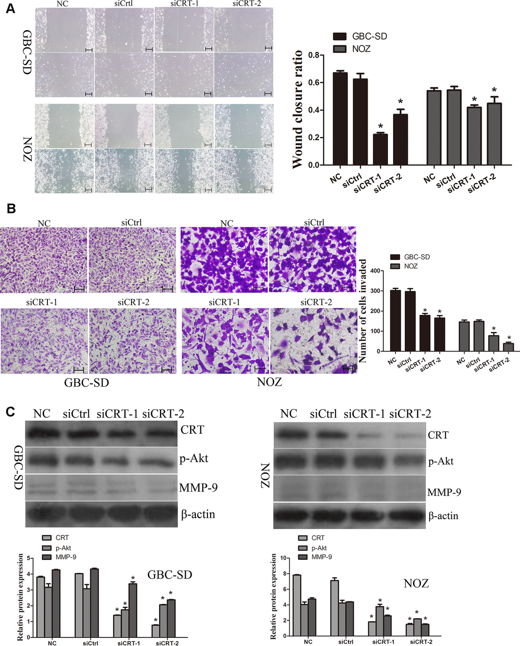 Knockdown of CRT inhibits cell migration by inhibiting MMP-9 expression in GBC-SD and NOZ cells