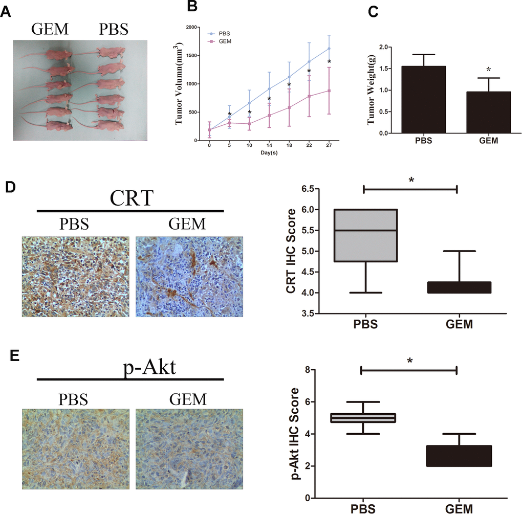 As shown in Figure 6A–6C, treatment with GEM significantly suppressed the growth and weight of tumors xenografted in immunodeficient BALB/c nude mice following subcutaneous injection of GBC-SD cells. In addition, treatment with GEM led to a decrease in the protein expression levels of CRT and p-Akt as assessed by IHC (Figure 6D, 6E), which was consistent with the aforementioned in vitro results.