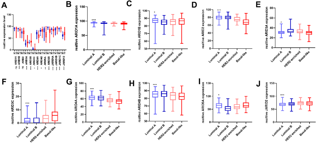 We analyzed both the tumor tissues and normal breast tissues using the TCGA database. The mRNA expression of ARID3A, ARID3B, ARID4B, JARID1B, JARID1C, JARID2 in tumor tissues was more expressive in normal tissues, ARID1B, ARID3C, ARID4A, ARID5A, ARID5B, JARID1A mRNA expression in tumor tissues were lower than that in the normal tissues (p<0.05) (Figure 1A). However, the ARID1A and ARID2 showed these results were not statistically significant. Then, we analyzed and obtained an overall view of the expression of ARID members across different molecular subtypes. The expression of ARID1A, ARID1B, ARID2, ARID3A, ARID4A, and ARID4B in no-luminal subtypes was lower than luminal subtypes, however, ARID3C, ARID5A, and JARID2 mRNA expression were higher in no-luminal subtypes of breast cancer tissues (Figure 1B–1J). The other five genes were not statistically significant (Supplementary Figure 1).