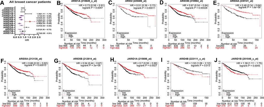 We respectively assessed the prognostic significances of the mRNA expression of 14 ARID family members (excluding ARID3C, no available matrix data) in human breast cancer patients at https://kmplot.com. Among them, 9 members were correlated with prognosis for all breast cancer patients (Figure 2A). The survival curves were displayed in Figure 2B–2H. High mRNA expression of ARID4B and JARID1B was interrelated with poor survival (Figure 2I, 2J, p=0.013 and p=0.0045). Low mRNA expression of ARID1A, ARID2, ARID3B, ARID4A, ARID5A, ARID5B, JARID1A were obviously associated with poor OS (Figure 2B–2H, p=0.0047, 0.00011, 0.00028, 1.60E-06, 0.0001, 2E−08 and 0.0027 respectively). The mRNA expression quantity of other ARID family members was not associated with OS (Supplementary Figure 2).
