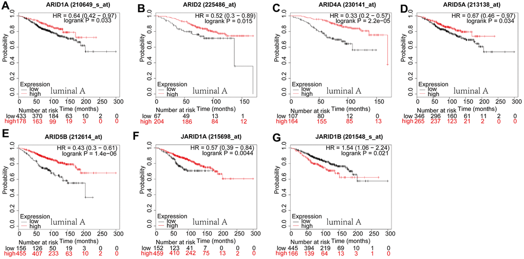 Then, we examined the prognostic significance of ARID family members in breast cancer with different intrinsic subtypes, containing luminal A, luminal B, HER2-riched, and basal-like. As shown in Figure 3, For ARID1A (Figure 3A: p=0.033), ARID2 (Figure 3B: p=0.015), ARID4A (Figure 3C: p=2.2e−05), ARID5A (Figure 3D: p=0.0338), ARID5B (Figure 3E: p=0.0000014) and JARID1A (Figure 3F: p=0.0044), their low levels of mRNA expression were correlated with shorter OS in cancers of luminal A type (Figure 3A–3F). For JARID1B (Figure 3G: p=0.0209), their high levels of mRNA expression were related to shorter OS in luminal A type of breast cancer patients. The rest of the ARID members were not correlated with OS in luminal A type breast cancer (Supplementary Figure 3).