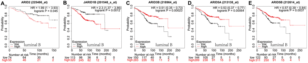 As shown in Table 2, the low mRNA expression of ARID1B (p=0.0023), ARID2 (p=0.0439), ARID4A (p=0.0056), ARID4B (p=0.0317), ARID5B (p=0.00054), JARID1D (p=0.043), JARID2 (p=0.0068) were interrelated with poor survival in breast cancer patients with negative lymph node. The mRNA expression of ARID1B (p=0.0375), ARID4B (p=0.0086), JARID1B (p=0.0003) and JARID1D (p=0.0138) were interrelated with worse survival in breast cancer patients with positive lymph node. The mRNA expression of ARID2 (p=0.0043), ARID3A (p=0.0423), ARID4A (p=0.000052) and ARID5B (p=0.0111) were interrelated with much better survival in lymph node positive breast cancer patients.