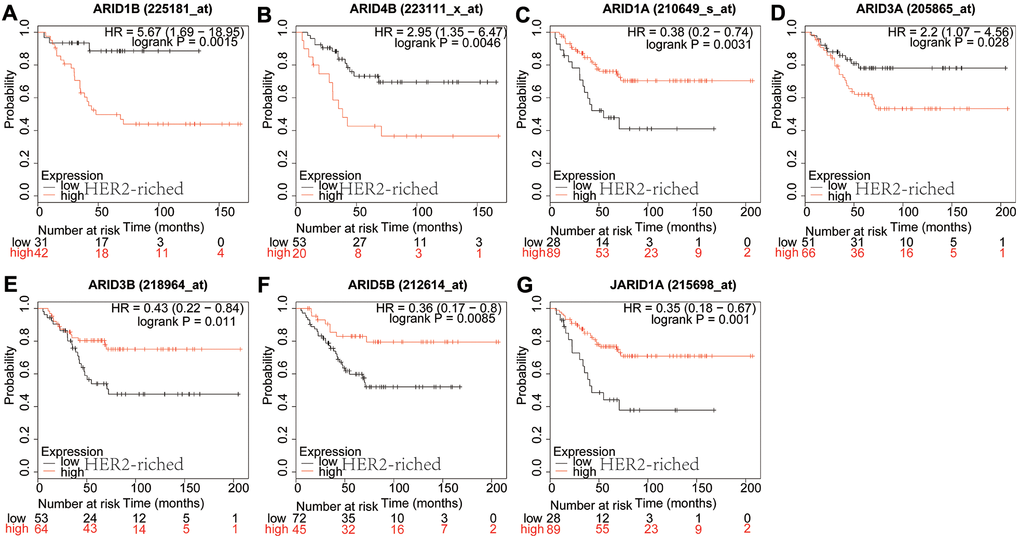 In luminal B type breast cancer, ARID2 (Figure 4A: p=0.045) and JARID1B (Figure 4B: p=0.0012) were correlated to a shorter OS. However, ARID3B (Figure 4C: p=0.0002), ARID5A (Figure 4D: p=0.0006) and ARID5B (Figure 4E: p=0.0037) were correlated with better survival. The rest members of the ARID family were not related to prognosis in breast cancer of luminal B (Supplementary Figure 4). In HER2-riched breast cancer patients, ARID1B (Figure 5A: p=0.0015) and ARID4B (Figure 5B: p=0.0046) were interrelated with shorter OS. However, ARID1A (Figure 5C: p=0.0031), ARID3A (Figure 5D: p=0.0285), ARID3B (Figure 5E: p=0.011), ARID5B (Figure 5F: p=0.0085) and JARID1A (Figure 5G: p=0.001) were associated with better survival. The rest members of the ARID family were not interrelated with prognosis in HER2-riched breast cancer (Supplementary Figure 5).