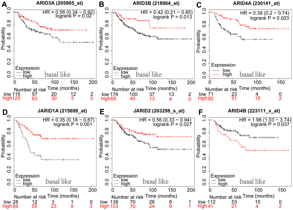 In basal-like breast cancer, mRNA expression of ARID4B (Figure 6F: p=0.0371) was interrelated with shorter OS. However, ARID3A (Figure 6A: p=0.0197), ARID3B (Figure 6B: p=0.013), ARID4A (Figure 6C: p=0.003), JARID1A (Figure 6D: p=0.0265), JARID2 (Figure 6E: p=0.0273) were interrelated with better survival. We have discovered the survival curves of the other members of ARID in basal-like breast cancer were irrelevant with prognosis (Supplementary Figure 6).