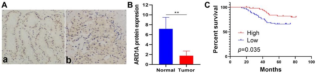 Further to verify the reliability of the above analysis, we chose ARID1A and performed protein level detection and analysis. Immunohistochemical staining (IHC) was used to detect the expression of ARID1A protein in 119 human breast cancer tissues and 32 normal adjacent tissues. A representative image of ARID1A IHC staining is shown in Figure 7A. Compared with normal adjacent tissues, the protein level of ARID1A in cancer tissues was obviously reduced (Figure 7B, p<0.01).