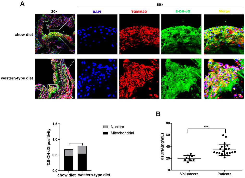 It is well known that mtDNA damage correlates with atherosclerosis progression [15, 18, 19]. DNA with oxidative damage is resistant to degradation by cytosolic nuclease three prime repair exonuclease 1(TREX1), and enhances STING-dependent immune sensing [20]. Released oxidized mtDNA acts as a powerful inflammatory stimulus [16]. In accordance with previous findings, immunofluorescence revealed that 8-Oxo-2′-deoxyguanosine (8-OH-dG), a marker for oxidative damage to DNA, can be detected in the plaque of ApoE -/- mice and strong 8-OH-dG staining was discovered mainly in mitochondria, irrespective of diet. In addition, part of the 8-OH-dG staining overlapped with neither nucleus nor mitochondria (Figure 1A), suggesting that oxidized DNA can be released into the cytoplasm or outside the cell. Additionally, human atherosclerotic plasma contained higher concentrations of dsDNA than those in healthy controls (Figure 1B), consistent with results demonstrated by previous studies [11, 13]. This released DNA could be the actuator for the development of atherosclerosis.