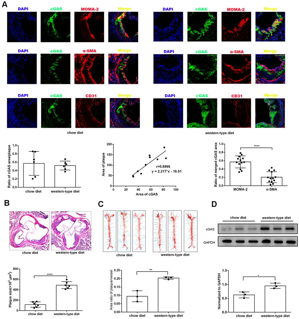 To explore the effects of cGAS on atherosclerosis, ApoE -/- mice were kept on a western-type or chow diet for 16 weeks. Results demonstrated that cGAS was expressed in the plaque of ApoE -/- mice regardless of diet, and was positively correlated with plaque area, and mainly distributed in macrophages (Figure 2A, 2B), whereas, the protein expression of cGAS in the aorta of ApoE -/- mice fed a western-type diet was higher than that of ApoE -/- mice fed a chow diet (Figure 2C, 2D). Importantly, cGAS inhibition reduced lipid deposition and foam cell formation in RAW264.7 macrophages (Figure 3A, 3B). These data demonstrated that cGAS contributed to atherosclerosis, and suggested that exploring the underlying mechanism could be of great significance.