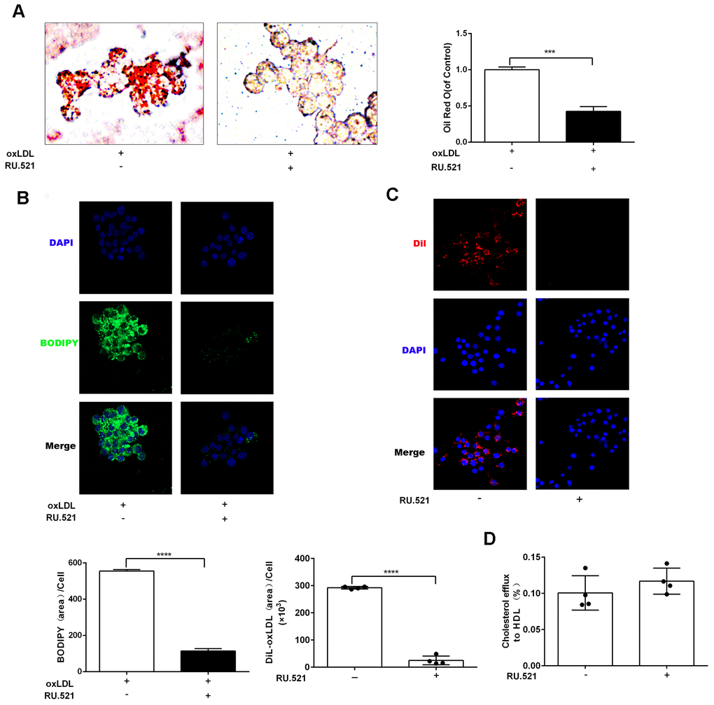 RAW264.7 macrophages were incubated in DMEM containing oxLDL (100 μg/mL, YB-002, Yiyuan Corporation) with or without RU.521 (2 μg/mL) for 24 h. After fixation for 20 min, cells were blocked with 1% BSA, followed by staining with BODIPY 493/503 (D3922, Invitrogen) for 30 min. Next, nuclei visualized by staining DAPI for 10 min. Finally, antifade mounting medium (P0126, Beyotime Institute of Biotechnology, Jiangsu, China) was applied to prevent fluorescence quenching. Images were acquired using a Nikon A1Si confocal microscope. Analysis of different images was performed using ImageJ and Adobe Photoshop CC. Oil Red O staining was carried out as previously described [66, 67]. RAW264.7 macrophages were incubated in DMEM containing oxLDL (100 μg/mL) with or without RU.521 (2 μg/mL) for 24 h. After fixation for 30 min, cells were stained with oil red O (G1015, Servicebio) for 30 min, and then visualized by light microscopy (Olympus, Tokyo, Japan).