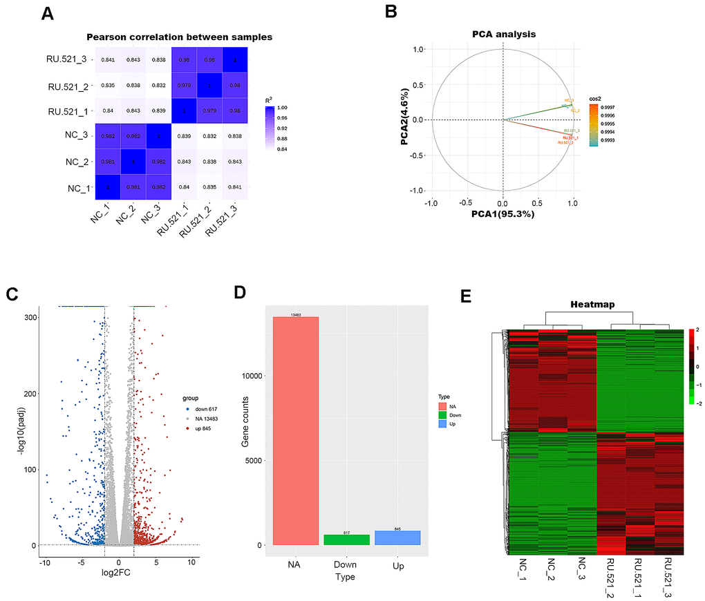 In order to have a better view of the mechanisms of atherosclerosis mediated by cGAS, we performed RNA-seq transcriptomic analysis of the underlying DEGs and the mechanisms in RAW264.7 macrophages treated for 12 h with or without RU.521, a cGAS inhibitor. The genes expressed were sequenced using the Illumia platform. DEGs between the cGAS inhibition group and the control group were detected. First, the intra-group samples showed a strong correlation (Figure 4A). Further, the repeatability of intra-group data based on principal component analysis (PCA) was acceptable, where the distances of intra-group samples were close. (Figure 4B).