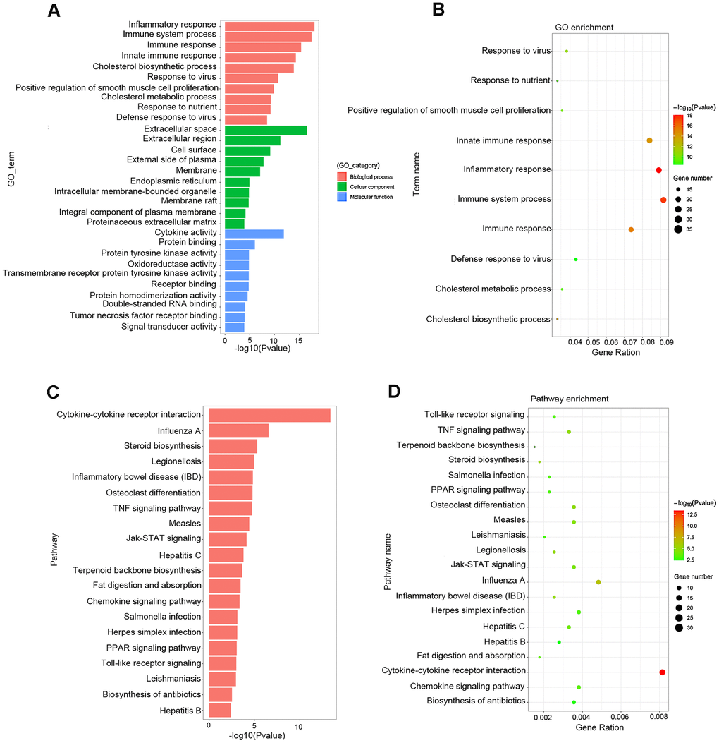Gene Ontology (GO) analysis showed that the main functional enrichments occurred in biological processes (BP), including inflammatory response, immune response, cholesterol biosynthetic process and so on, which are of great importance in the formation and progression of atherosclerotic plaque. In addition, GO terms linked to molecular function (MF) and cellular compartments (CC) were also discovered, such as extracellular space, cell surface, endoplasmic reticulum, and cytokine activity (Figure 5A, 5B and Table 3). Kyoto Encyclopedia of Genes and Genomes (KEGG) pathway analysis showed comparable results, with the most significant KEGG terms associated with atherosclerosis being cytokine–cytokine receptor interaction, Jak–STAT signaling pathway, steroid biosynthesis, chemokine signaling pathway, TNF signaling pathway, fat digestion and absorption, PPAR signaling pathway and TLR signaling pathway (Figure 5C, 5D and Table 4).