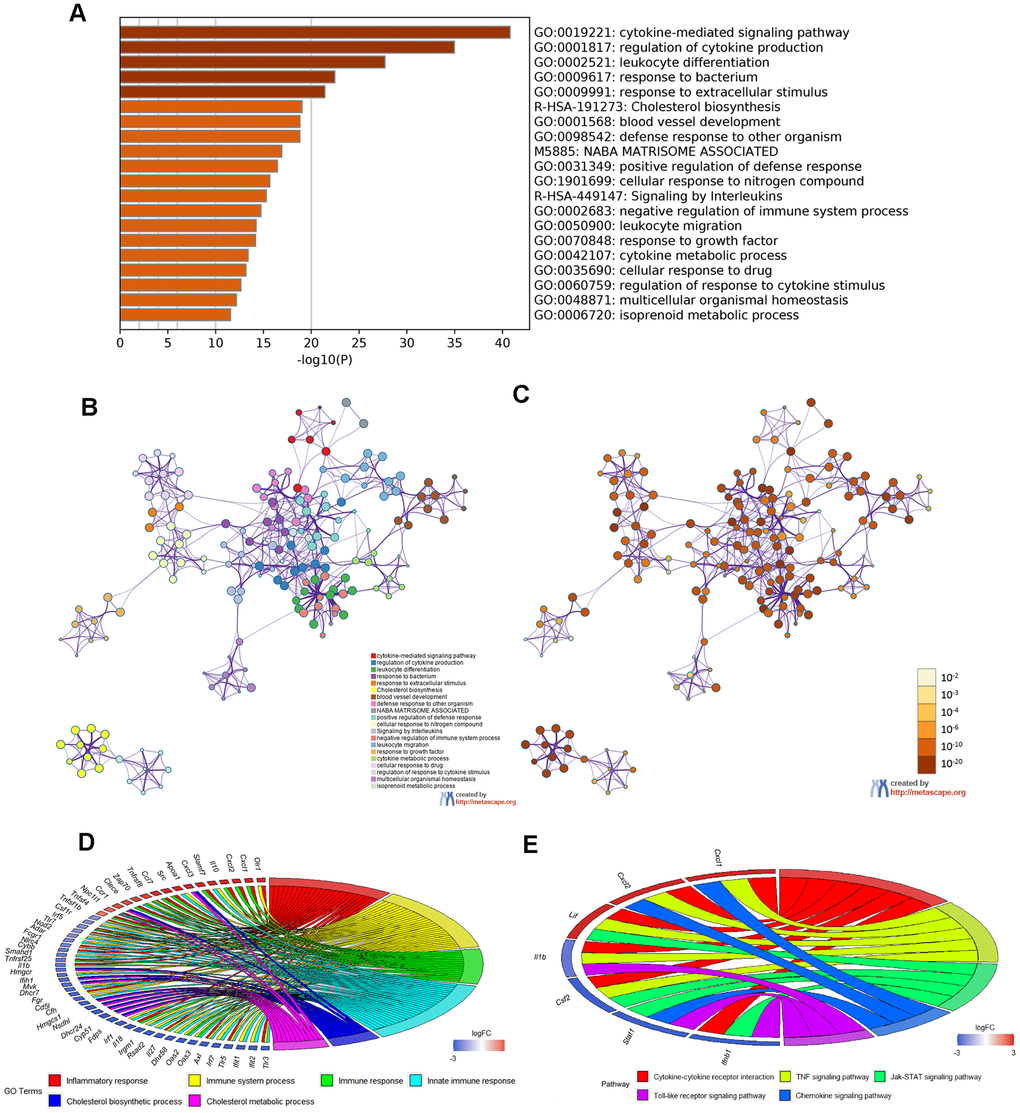 Moreover, Metascape analysis showed remarkable enrichment in regulation of the cytokine-mediated signaling pathway (Figure 6A–6C). There were 22 overlapped DEGs in both GO enriched terms “Inflammatory response” and “Immune system process”/ “Immune response”/ “Innate immune response” and seven overlapped DEGs in the KEGG analysis terms “Cytokine–cytokine receptor interaction”, “TNF signaling pathway”, “Jak–STAT signaling pathway”, “ Chemokine signaling pathway” and “Toll-like receptor signaling pathway”(Figure 6D, 6E and Tables 5, 6).