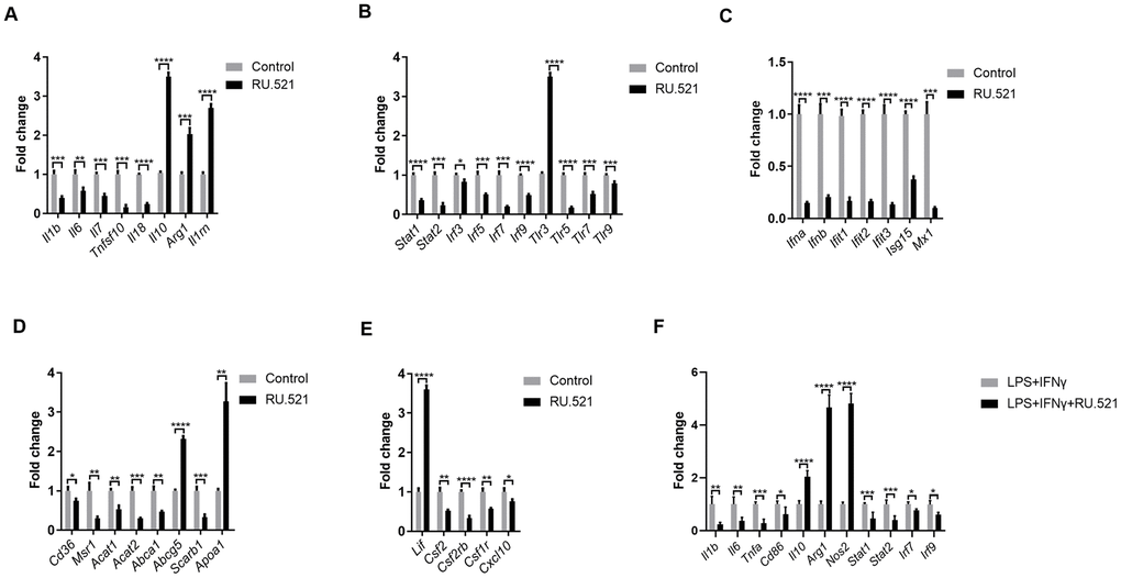 In order to understand whether cGAS inhibition changes expression of the genes involved in modulating atherosclerosis, we identified DEGs in cGAS inhibition probably linked to atherosclerosis according to research published in the PubMed database. A total of 275 DEGs associated with atherosclerosis were found when cGAS was inhibited (Supplementary Table 3). These DEGs included colony-stimulating factors (Csfs such as Csf2, Csf2rb, Csf1r, and Lif.), interleukins (Ils, including Il1b ,Il7, Il18, Il10.), tumor necrosis factor family members (such as TNF superfamily members–Tnfsf–Tnfsf10, Tnfsf8, and Tnfsf11a.), toll-like receptors (Tlrs including Tlr3, Tlr5, and Tlr7), interferon regulatory factors (Irfs, Irf5, Irf7, and Irf9), genes related to cholesterol metabolism (Msr1, Acat2, Apoa1, Abca1 and Abcg5), signal transducers and activators of transcription (Stats, such as Stat1, and Stat2), IFN and IFN-stimulated genes (Isgs, Ifna, Ifnb, Ifit1, Ifit2, and Isg15.) and so on. In addition, expression of Il6, Tlr9, Irf3, Cd36, Acat1 and Sting were also decreased despite absolute log2FC < 2.