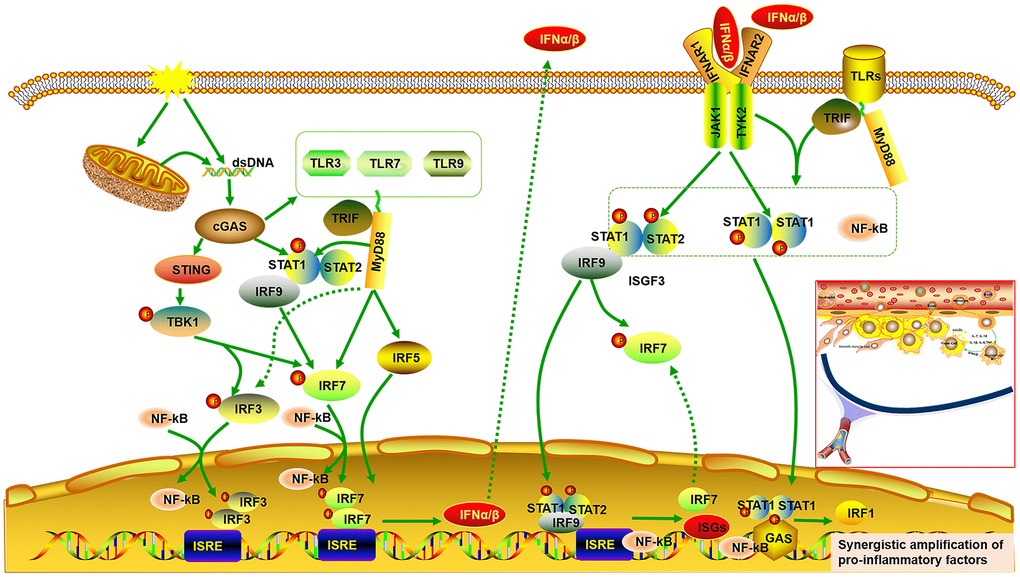 Atherosclerosis, the primary etiological factor of cardio-cerebrovascular diseases which are the leading cause of death worldwide, is a chronic inflammatory process with characteristic modified low-density lipoprotein (mLDL) deposition which drives the recruitment of circulating immune cells that subsequently trigger inflammatory cascades [10]. Great efforts have been made to elucidate the mechanisms of atherosclerosis, but nevertheless, it has not yet been fully clarified. Accumulating evidence has shown that mis-localized self-DNA and DNA damage occur in atherosclerosis. The Health 2000 Survey showed that in women without hormone replacement therapy (HRT), higher circulating cell-free DNA levels indicate worse arterial elasticity [11]. Mitochondrial DNA(mtDNA), a small double-stranded circular form of DNA, is increasingly recognized as a potent stimulus in innate immune responses and inflammation [12]. A study carried out by Zhang et al. demonstrated that human atherosclerotic plasma contains higher concentrations of mtDNA than those in healthy controls [13]. Furthermore, mtDNA is released into the cytoplasm under oxidized LDL(oxLDL) stimulation [14]. In addition, it is reported that increased plaque necrosis core and induction by mtDNA damage are attributable to apoptosis of smooth muscle cells and monocytes rather than reactive oxygen species [15]. Furthermore, mtDNA can directly provoke inflammatory response by engaging the cGAS-STING pathway. Besides, extracellular release of oxidized mtDNA is also demonstrated to be pro-inflammatory in vitro, and type-I interferon (IFN) signaling was stimulated in response to the DNA sensor when oxidized mtDNA is injected into mice [16]. Hypothetically therefore, cGAS may play a pivotal role in the development of atherosclerosis. Exploring the role of cGAS in atherosclerosis and the possible underlying mechanisms may provide a new potential therapeutic target for atherosclerosis.