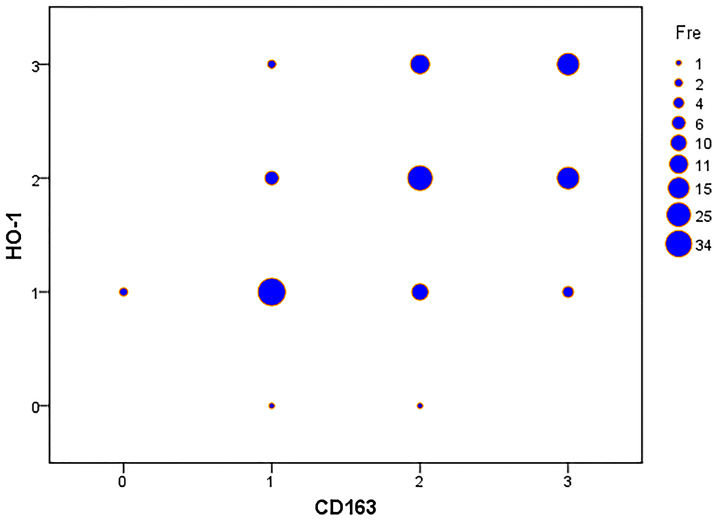 Histochemical sections stained with immunohisto-chemistry were reviewed and scored by two experienced pathologists with discrepancies, if any, being resolved by consensus. The staining intensities of HO-1 and CD163 were scored on a 0-3 scale (0 = no staining, 1 = weak staining, 2 = moderate staining, 3 = strong staining). Similar to previous convention [7], staining intensities with scores no greater than 1 were defined as low expression while as high expression when scores are above 1 (Figure 1).