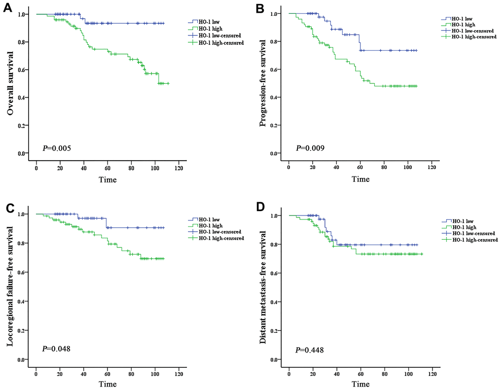 Heme oxygenase-1 (HO-1) is well-known as a stress-inducible protein in response to oxidative stress and inflammatory stimuli, owing to the anti-inflammatory and immunomodulatory properties [8]. Recently, researchers have reported that HO-1 plays a crucial role in polarization of M2 macrophages [9]. Moreover, HO-1 was found to be over-expressed in various tumors, and it is considered to be a key pro-tumor molecule against host attack as well as chemotherapy and radiation therapy [10–13]. Shi et al. examined HO-1 expression using RT-PCR in 32 NPC patients, and the results showed that HO-1 expression was found in 19 patients (59.4%), among which nine (47.4%) showed no response to radiotherapy, while among the 13 patients with HO-1 negative expression 12 (92.3%) exhibited responsiveness to radiotherapy, suggesting that high expression of HO-1 might correlate with poor response to radiotherapy [14]. However, this study was done with rather small number of patients and short follow-up periods, thus largely restricting the interpretation of the prognosis significances, especially in survival and disease progression of HO-1 in NPC.