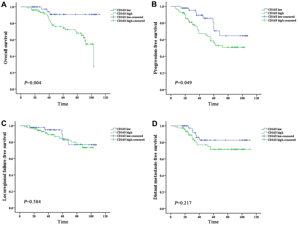Subgroups analysis was performed to discriminate the potential prognostic factors on predicting survival. Both univariate and multivariate analysis revealed that patients with high expression of HO-1 or CD163 showed worse OS and PFS than those with low scoring (P < 0.05) (Tables 3, 4 and Figures 3A, 3B, 4A, 4B). The 4-year OS and PFS of the HO-1high group (74.8% and 67.3%, respectively) were significantly lower than those of the HO-1low group (93.4% and 84.8%, respectively) with P values less than 0.05. The 4-year OS and PFS between CD163high and CD163low groups were 76.2% versus 90.8% (P = 0.006) and 67.4% versus 85.7% (P = 0.033), respectively. Results of survival analysis also indicated that higher HO-1 expression was associated with lower LRFFS of patients (P = 0.048) (Figure 3C). However, no significant correlation was found between the expression levels of HO-1 or CD163 and DMFS (P>0.05) (Figure 3D, 4D). In addition, independent prognostic factors for PFS were also examined among other groups of patients with different N stage (N0-2 vs N3, P = 0.005) and clinical stage (stage I–III vs stage IVA, P = 0.007), and stage IVA patients demonstrated a worse OS than those with stage I–III (P = 0.012).