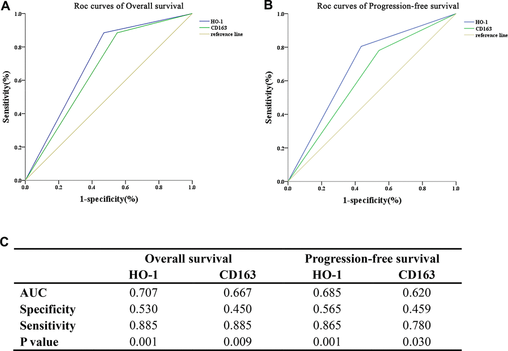 To further assess the predictive capability of HO-1 and CD163 for OS and PFS in NPC, the area under the curve (AUC) for the ROC curves were evaluated (Figure 5). These results showed that the AUC values of HO-1 in predicting OS and PFS of patients were 0.707 and 0.685, respectively, overperforming those of CD163 (0.667 and 0.620).