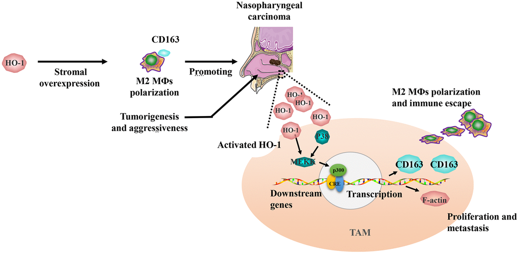 Interestingly, our study also found that considerable amounts of TAMs exhibited co-expression of HO-1 and CD163, and Spearman’s correlation analysis revealed a significant correlation between the expression levels of HO-1 and CD163. Combined with the phenomenon that M2 macrophage polarization could be induced by HO-1 overexpression [14], the correlation of HO-1 and CD163 might be involved in M2 TAMs activation and tumor aggressiveness in NPC (Figure 6). Additionally, the results of ROC analysis revealed that HO-1 was a superior predictor for OS and PFS as compared to CD163. Based on these findings, the strategy of targeting TAMs by inhibiting HO-1 activity appears to be promising for the patients with HO-1 overexpression.