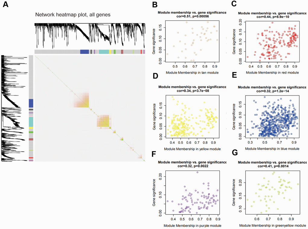 The interaction of 12 modules was analyzed by the network heatmap (Figure 3A). This analysis revealed that every module was independent of each other, suggesting that these 12 modules posed high-scale independence degree and significant independence of genes expression in every module. Afterwards, correlation analysis was implemented between each module and clinical features. Results indicated that tan and red modules were significantly correlated with the tumor Nude (N) stage of PAAD (Figure 3B, 3C); yellow, blue and purple modules were remarkably associated with PAAD tumor Stage (S) stage (Figure 3D–3F); the one that related to Tumor (T) stage was green-yellow (Figure 3G).
