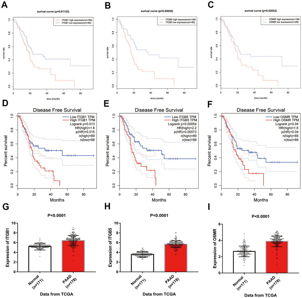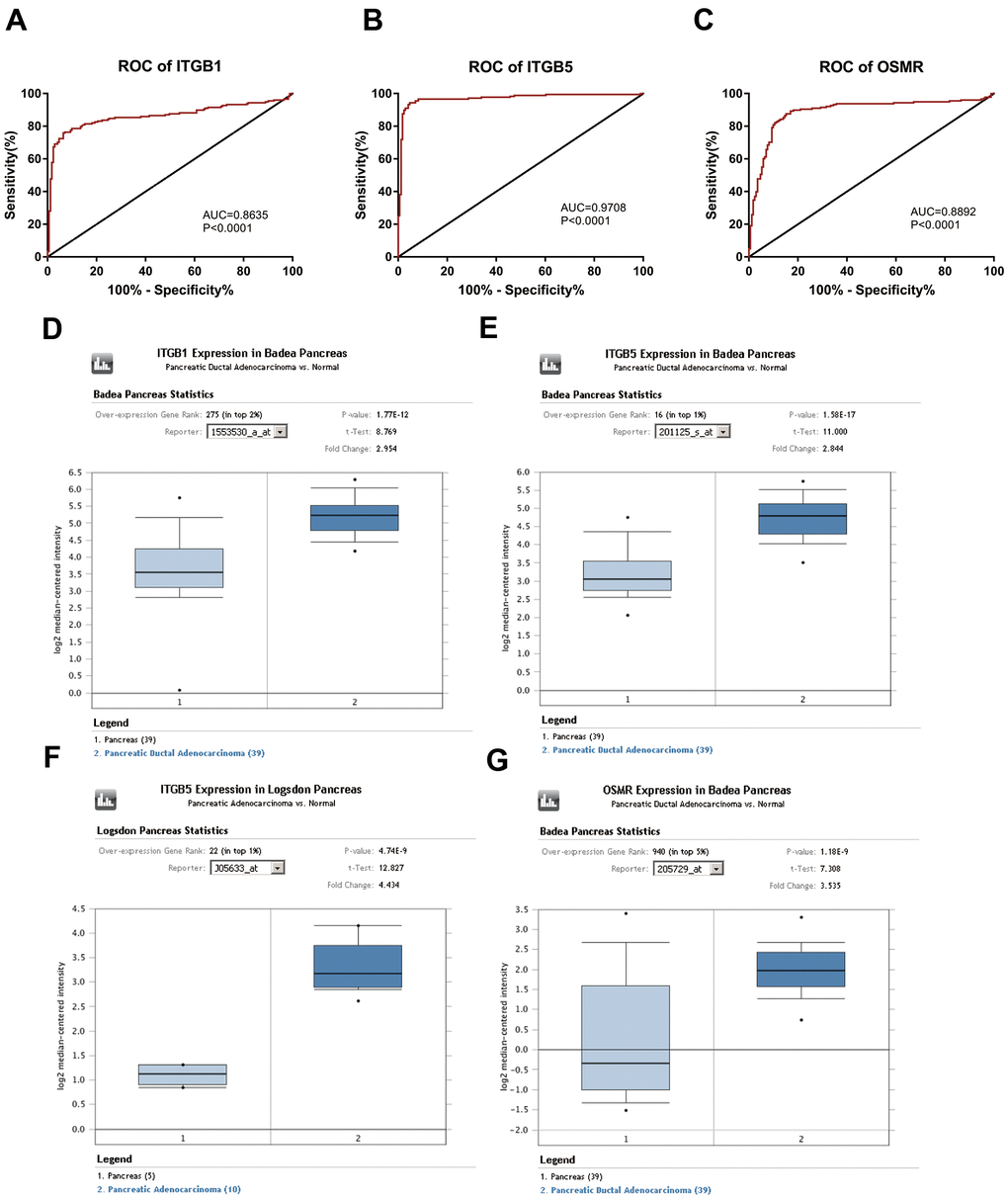 Based on the results of KEGG enrichment analysis, we found that the majority genes of blue module were enriched in PI3K/Akt signaling pathway (Figure 4B). To identify the hub genes, Kaplan-Meier method was performed to plot the survival curves of genes enriched in PI3K/Akt pathway for the assessment of prognostic significance and three genes (ITGB1, ITGB5, and OSMR) were observed to be significantly associated with prognosis of PAAD patients. The detailed information of clinical samples were shown in Supplementary Table 3, and datasets used for survival analysis were exhibited in Supplementary Table 4. As shown in Figure 5A–5C, PAAD patients with high expression of ITGB1, ITGB5, and OSMR had poorer outcomes, while patients in down-regulation of ITGB1, ITGB5, and OSMR group showed a higher survival rate (P < 0.05). Similarly, ITGB1, ITGB5, and OSMR were also negatively associated with the disease free survival of PAAD patients (Figure 5D–5F, P < 0.05). The expression levels of ITGB1, ITGB5, and OSMR were remarkably increased in PAAD tissue samples in contrast to normal pancreas specimens (Figure 5G–5I, P < 0.0001). In addition, ROC curves revealed that ITGB1, ITGB5, and OSMR function as crucial factors on the diagnosis of PAAD (Figure 6A–6C, P < 0.0001). Afterwards, the Oncomine datasets were utilized to verify the expression levels of these three key genes and discovered that compared with the pancreas tissues, the PAAD tumor tissues exhibited high expression levels of ITGB1, ITGB5, and OSMR (Figure 6D–6G, P < 0.05). A prognostic model using OSMR, ITGB1 and ITGB5 was also constructed. The risk score distribution of three-gene signature was revealed in Supplementary Figure 1. Compared with other signature risk score that identified in previous reports [10–12], the predictive effect of our model on the 5-year survival rate was better than other models (Supplementary Figure 2). The expression levels of ITGB1, ITGB5 and OSMR in different stages were determined and showed in Supplementary Figure 3, which unveiled that the expression levels of ITGB1, ITGB5 and OSMR in the late stage were generally higher than those in the early stage. This result manifested that the three hub genes were not suitable as early diagnostic indicators, but of certain significance for the assessment of the progression and prognosis of PAAD. Prognostic values of ITGB1, ITGB5 and OSMR were tested using multivariate analyses, which exhibited in Supplementary Figure 4. Collectively, these observations elucidated that ITGB1, ITGB5, and OSMR might serve as important biomarkers for the prognosis and diagnosis of PAAD.