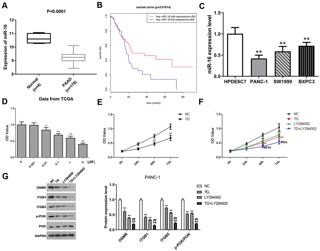 To explore the potential molecular mechanism of three hub genes, we firstly screened the DEmiRs in PAAD based on the TCGA database. The limma package of R software was applied to conduct difference analysis in accordance with the threshold (|logFC| > 1 and FDR < 0.05). A total of 17 DEmiRs were obtained, including 2 up-regulated miRs and 15 down-regulated miRs. The miRs that have potential interactions with ITGB1, ITGB5, and OSMR were predicted using TargetScan website. The predicted miRs of three hub genes and DEmiRs that were decreased in PAAD were intersected, and results showed that ITGB1 and ITGB5 had a common regulatory miR, namely miR-16. Therefore, we speculated that miR-16 might inhibit the progression of PAAD by mediating the ITGB1/ITGB5/PI3K/Akt signaling pathway. To further validate the hypothesis, we subsequently analyzed the expression level of miR-16 in PAAD tissues and found that miR-16 expression was significantly reduced in PAAD tissue samples compared with normal controls (Figure 7A, P < 0.0001). Figure 7B suggested that miR-16 was positively correlated with survival rates of PAAD patients (P < 0.05). Moreover, miR-16 was expressed in PAAD cell lines at lower levels relative to HPDE6C7 (Figure 7C, P < 0.01). PANC-1 cell line was selected in the following experiments due to its lowest miR-16 expression. In summary, these findings demonstrated that miR-16 might affect the development of PAAD via regulating ITGB1/ITGB5.
