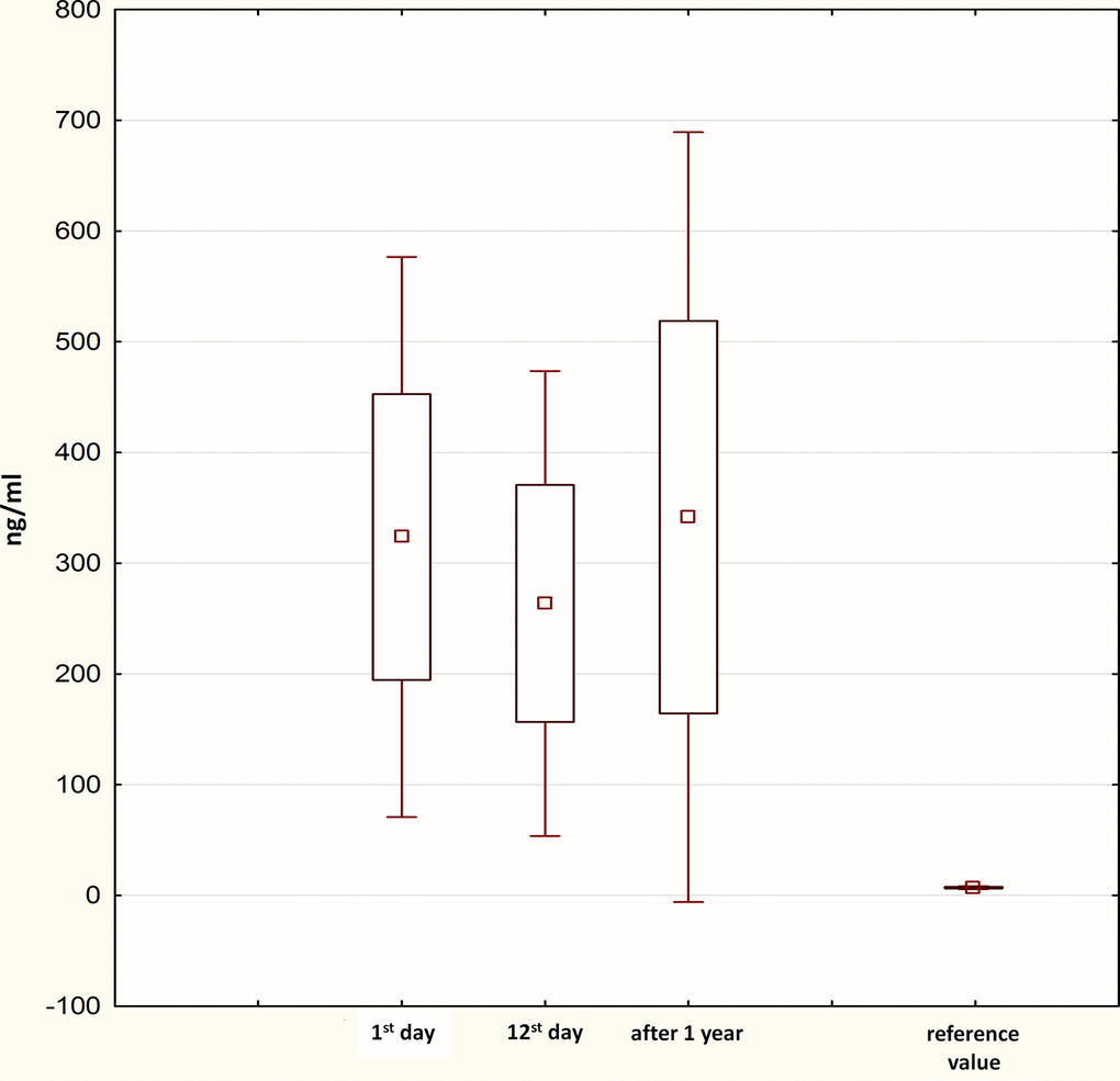 Figure 1 shows the progression of PIIINP concentrations. Elevated levels of PIIINP at day 1 post-MI (311.2 [220.1; 376.3] ng/mL) decreased to 223.3 [195.3; 312.1] ng/mL at day 12 post-MI and then reached the initial values 1 year after STEMI (312.6 [228.0; 383.8] ng/mL). There were significant differences between the A and B (p<0.001) and B and C (p=0.002) time points.