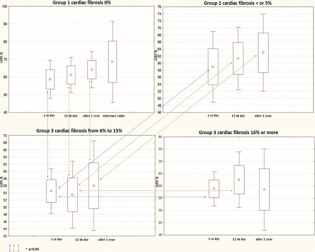 Patients with cardiac fibrosis covering up to 5% of the myocardium demonstrated a significant improvement in LVEF only in the in-hospital period, when LVEF increased from 60% [56; 63] to 63% [60; 64]% (p=0.038). Despite further improvement up to 65% [61; 65], changes were statistically insignificant. Another trend was determined in patients with cardiac fibrosis ranging from 6% to 15%. Contractile function decreased in this group at each control time point.