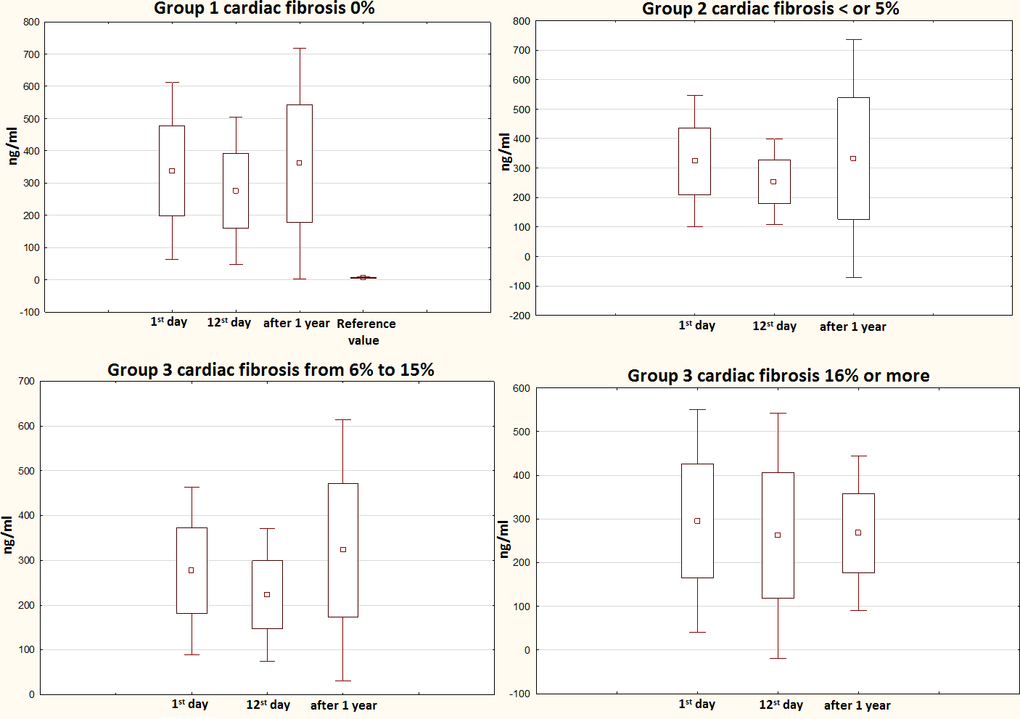 At the 1-year follow-up, patients were assigned to four groups based on the MRI findings: Group 1 (n=49, 57%), patients without cardiac fibrosis, whose average age was 57.9 years; Group 2 (n=18, 21%), patients with cardiac fibrosis covering ≤5% of the myocardium, whose average age was 61.2 years; Group 3 (n=10, 12%), patients with cardiac fibrosis ranging between 6% and 15%, whose average age was 55.9 years; and Group 4 (n=9, 10%), patients with cardiac fibrosis over 16%, whose average age was 54.8 years [9]. Patient groups, divided by the severity of cardiofibrosis, were comparable in terms of therapy.
