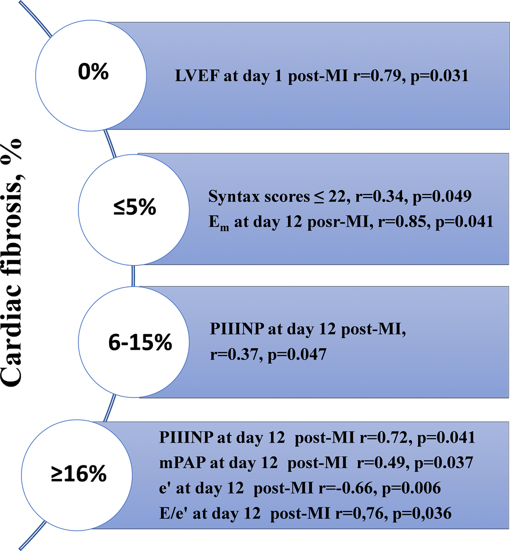 Correlation analysis of echocardiography parameters and the presence of cardiac fibrosis has provided new data for the biomedical society. The positive relationship between severe cardiac fibrosis and an area of ≥16% with diastolic function at day 12 post-MI was established. A decrease in e’, mPAP, and E/e’ from the day 1 post-MI measurements should be regarded as an alarm in terms of predicting cardiac fibrosis in the long-term period after MI with preserved LVEF [10].