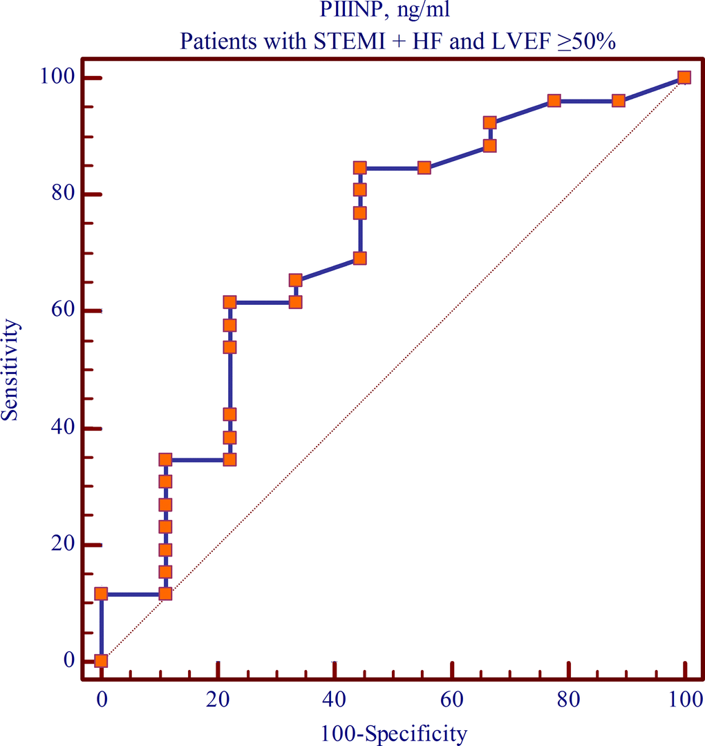 Therefore, studies of heart failure (HF) with preserved left ventricular function after myocardial infarction are of particular interest. Myocardial fibrosis is one of the most significant mechanisms of the formation and progression of LV myocardial dysfunction. The diagnostic and prognostic potential of a number of serum biomarkers of myocardial fibrosis has been studied. The most promising ones include procollagen precursors, including N-terminal propeptide of type III procollagen [PIIINP]) [5–7]. However, the specificity of serum biomarkers is not high and biomarker levels are known to also be affected by various pathological conditions (osteoporosis, cancer, connective tissue diseases, etc.). Endomyocardial biopsy is a routine method for the diagnosis of myocardial fibrosis. Since this procedure is an invasive one, it is still associated with several complications at a rate of up to 0.8%. Thus, it is important to establish highly informative non-invasive visualizing methods for determining the qualitative and quantitative parameters of fibrosis [8]. In recent years, contrast magnetic resonance imaging (MRI) has emerged as a promising tool to diagnose and evaluate cardiac fibrosis. However, the question regarding the best method to predict the development of fibrosis remains unanswered, since there are no convincing data on the prognostic value of the available biochemical markers of fibrosis, as well as cardiac structural and functional parameters, for the evaluation of patients with myocardial infarction (MI). We hypothesized that echocardiographic indicators with serum biomarkers for fibrosis, evaluated within the in-hospital period after MI, may have beneficial potential for predicting the development of cardiac fibrosis. Our study aimed to evaluate the role of the serum marker for fibrosis—PIIINP—and cardiac structural and functional parameters in the prediction of cardiac fibrosis 1 year after ST-segment elevation myocardial infarction (STEMI) with preserved left ventricular ejection fraction (LVEF).