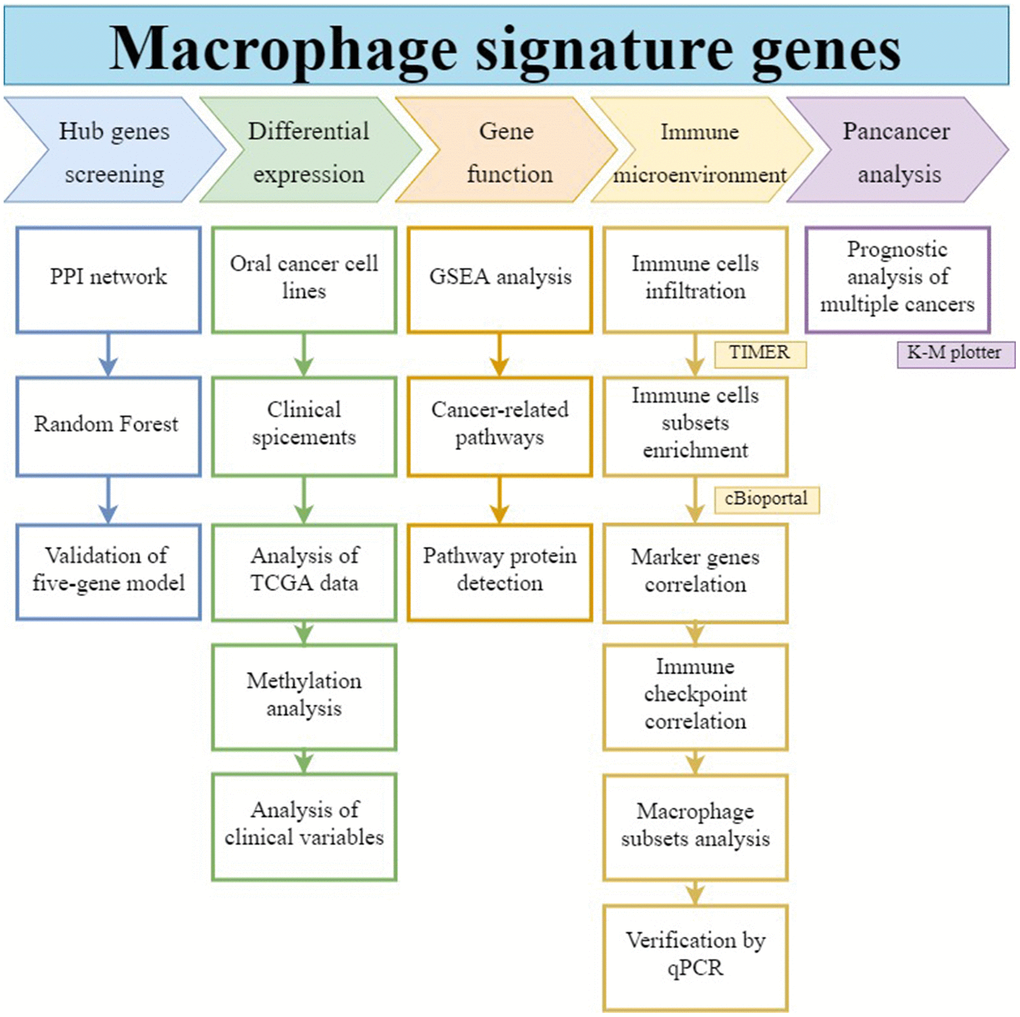 As shown in the workflow of Figure 1, in this study we operated a random forest algorithm to screen the hub genes set in the signatures of macrophages, construct a prognostic model, analyze its function and role in the immune cell network, as well as its impact on prognosis in pan-cancers.