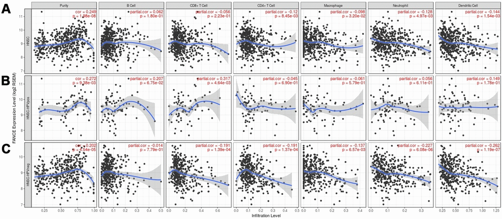 We found that the level of FANCE expression correlated with high levels of immune infiltration in four types of immune cells in the TIMER dataset as well as tumor purity. Figure 10 shows that FANCE expression was significantly negatively correlated with CD4+ T cell, neutrophil, macrophage, and DC infiltration. Similarly, in HPV-negative HNSC samples, the infiltration levels of these four lymphocytes and CD8 + T cells were also found to be significantly correlated with the expression of FANCE. However, positive correlation was found between CD4 + T cell infiltration and FANCE expression in HPV-negative patients.