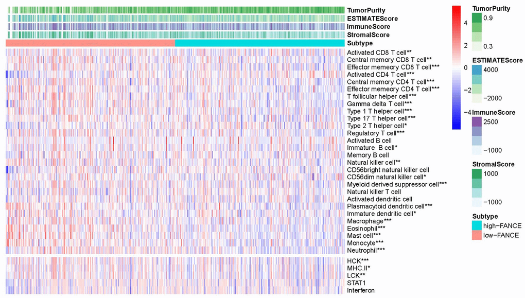 Figure 11 shows that FANCE expression was significantly negatively associated with an abundance of Act CD8, Tcm CD8, Tem CD8, Act CD4, Tcm CD4, Tem CD4, Tfh, Tgd, Th1, Th17, Th2, Treg, Imm B, NK, CD56dim, MDSCs, pDCs, iDCs, MHC II, LCK, macrophages, eosinophils, Mast, monocytes, and neutrophils (all P values < 0.05). The scoring data of 33 kinds of immune cells are based on the results of ESTIMATE calculation could be obtained from Supplementary Table 6.