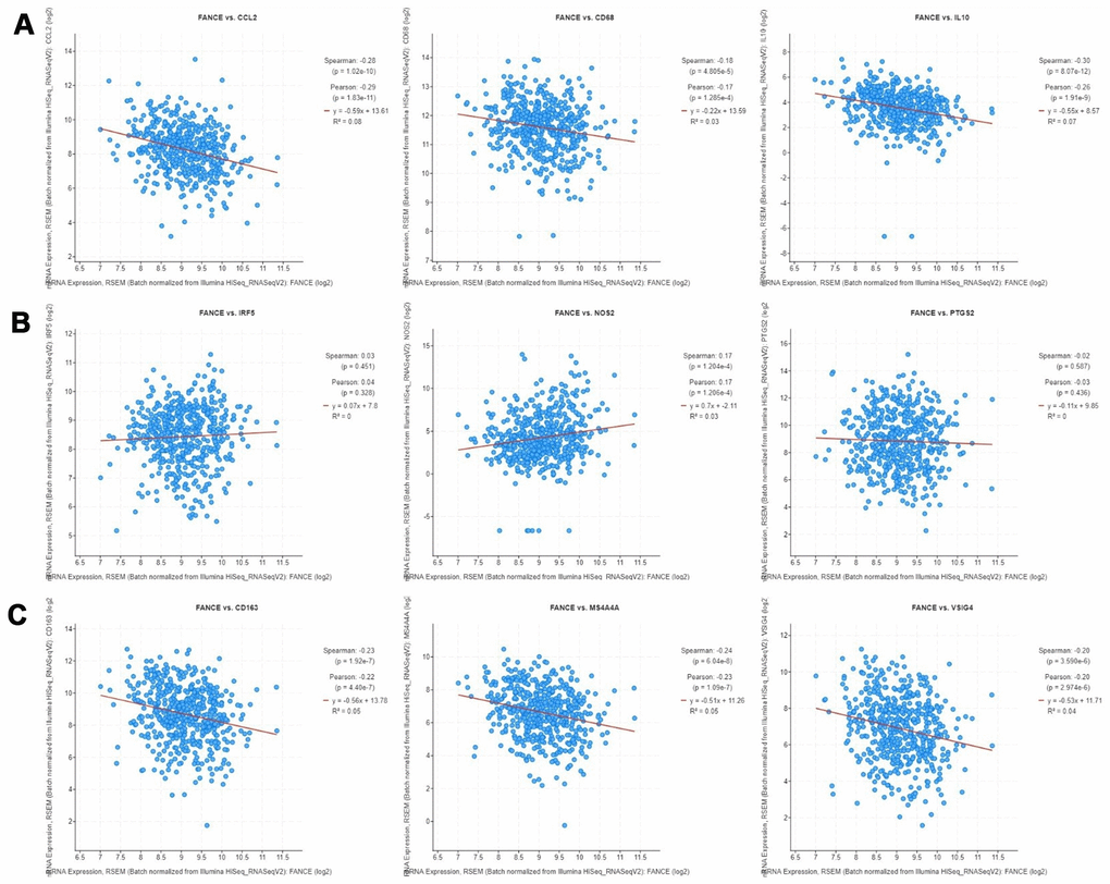 The correlation between the expression of FANCE on M1, M2 macrophage phenotypes and TAM was calculated in HNSC. As shown in Figure 13, TAM marker genes, especially hyaluronan mediated motility receptor (CD68), Interleukin 10 (IL10) and chemokine (C-C motif) ligand 2 (CCL2), as well as CD163, V-set and immunoglobulin domain containing 4 (VSIG4) and membrane spanning 4-domains A4A (MS4A4A) of M2 macrophage phenotype, were significantly negatively correlated with the expression of FANCE in HNSC (*P<0.05). The expression of M1 marker genes, such as nitric oxide synthase 2 (NOS2), interferon regulatory factor 5 (IRF5), prostaglandin-endoperoxide synthase 2 (PTGS2), showed generally positively correlated with the expression of FANCE.